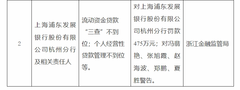 1月21日弘大速配,国家金融监督管理总局浙江监管局行政处罚信息公开表显示,上海浦东发展银行股份有限公司杭州分行,流动资金贷款“三查”不到位;个人经营性贷款管理不到位等,被罚款475万元;责任人冯翡艳、张旭霞、赵海波、郑鹏、夏胜被警告。